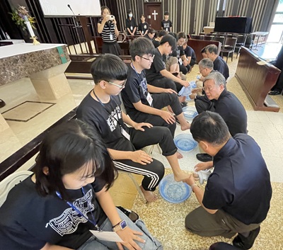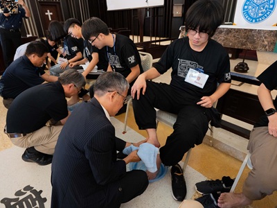 在9月4日舉行的幹部訓練結業式上,最具教育意義的「濯足禮」成為全場焦點。董事會曾鴻鍊執行董事、唐彥博校長、吳興祥校牧與多位校友總會理監事、秘書處幹部一同俯身為學生幹部洗腳,傳達「領導不是權威,而是責任;不是命令,而是陪伴」的重要提醒。