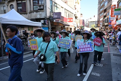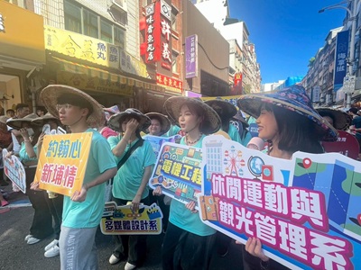 聖約翰科大隊伍以「閃耀淡江大橋」為核心意象,服裝以象徵橋樑的 TIFFE 藍色系為主調,並搭配巧思道具,展現跨世代連結與邁向未來的精神。師生透過舞蹈與音樂,生動詮釋「橋樑」所承載的串聯與融合意義,成為踩街行列中的一大亮點。
