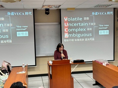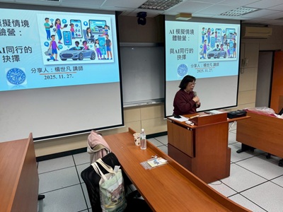 楊世凡講師以 VUCA 與 BANI 世界觀為引導,說明人工智慧如何加速環境變動並帶來隱私、偏誤、資源分配與科技治理等挑戰。她指出:「AI 能給建議,但不能替你做決定。」課程亦示範運用 ChatGPT、Co-Pilot 等工具進行情境推演與資料蒐集,並透過角色設定與情境描述提升學生的應用能力,使科技議題與學生情緒、價值與生涯思考緊密連結。