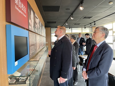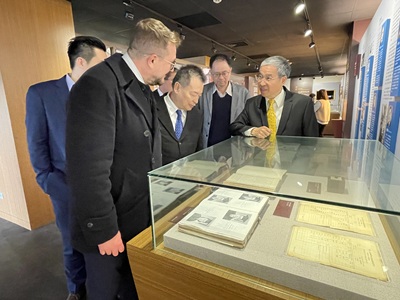 儀式結束後,與會貴賓隨即展開校園參訪行程。首站來到「沈祖海國際會議廳」,參觀校內最大的國際會議廳,之後造訪「上海聖約翰大學校史典藏暨研究中心」,透過豐富的文獻展示,向美商團隊介紹聖約翰大學從上海到台灣的百年風華與辦學成就。