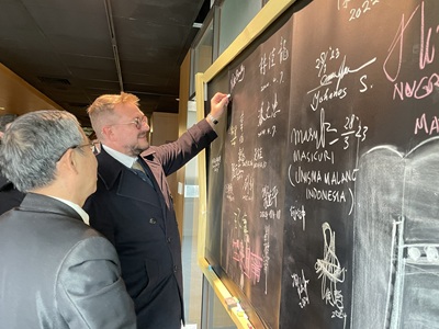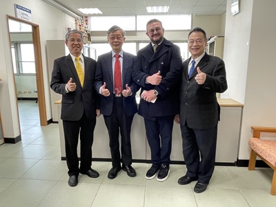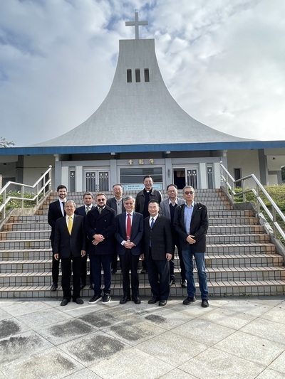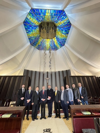 隨後,貴賓一行人陸續參觀多媒體設計系的環境及設備,並親自造訪位於商管大樓8樓的「RWA發展研究中心籌備處預定地」。Nathaniel Bradley主席對辦公空間的規劃表示肯定,認為這裡將成為完善 RWA系統與培育國際人才的「卓越中心」。參訪最後一站則來到校園精神地標「降臨堂」,這座擁有雅各天梯彩繪玻璃的美麗教堂讓外賓印象深刻。