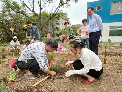 啟用儀式由唐彥博校長親自領軍,偕同曾鴻鍊執行董事、沈文賜學長、台灣長青橄欖球俱樂部會長暨66級紡織科校友陳永生學長,以及樂齡福祉與健康促進系鍾秀琴主任、李旻陽老師等師長嘉賓共同揭開序幕。眾人紛紛換上雨鞋、戴起手套,歡喜雀躍地下田參與種植。
