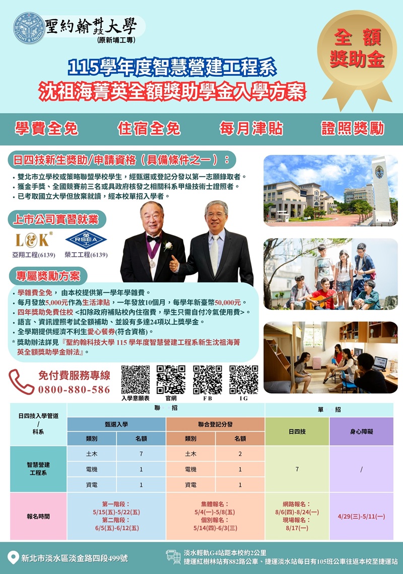 國際知名建築大師沈祖海家族秉持沈祖海大師遺志,連續17年捐款聖約翰科技大學,自2025年起,捐款由3萬美金提升至6萬美金。為感念創校董事沈祖海對母校的深厚情感與卓越貢獻,聖約翰科大將以此資源深度挹注新成立的「智慧營建工程系」,不僅祭出學雜費全免、住宿免費及提供生活津貼等全額獎學金,更斥資建置BIM暨ESG特色實驗室,期盼在AI與永續發展的浪潮下,培育具備大師人文精神與頂尖技術的智慧營建人才。