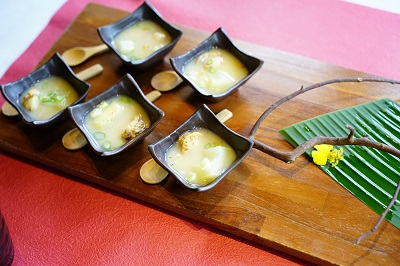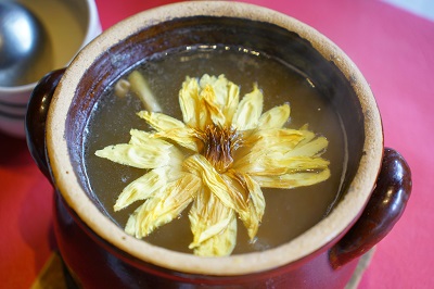 招牌「蓮花雞湯」更是一場視覺與味覺的饗宴:乾燥蓮花放入滾湯中,隨著熱氣蒸騰、瞬間綻放如畫。湯底以蔬菜高湯為基底,再加入雞腿肉、鷹嘴豆、蓮子、銀杏、樹薯、筍絲及荸薺…等豐富食材熬煮,濃郁醇厚、滋味層次分明。