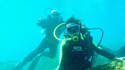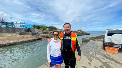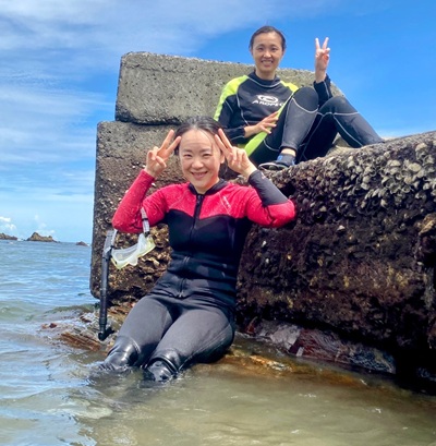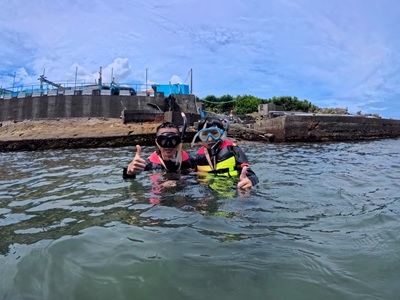 吳育潼學妹(前)與威德學長夫人(後)一同參與潛水活動,解鎖「潛水」人生初體驗。 |