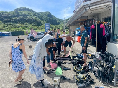 校友們在「達克海洋」基地更換裝備,從防寒衣到蛙鞋一應俱全,為下水做好萬全準備。 |