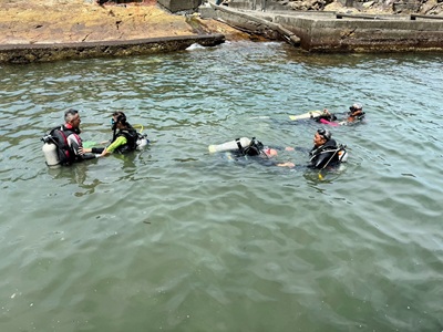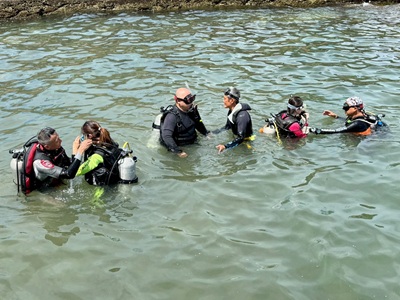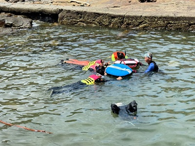 學員們穿戴好潛水裝備,在教練的協助下分組下水,準備迎接第一次的海底體驗。 |