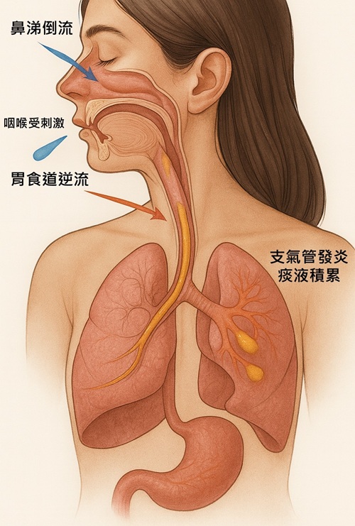 胃酸逆流至食道,刺激喉嚨和氣管,引發持續咳嗽。