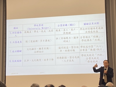 會後,一路陪伴63機械忠班成長的班導師黃繁光老師盛讚演講前的「咖啡會談」十分貼心,讓師生得以齊聚一堂,暢言生活體驗、交換人生心得。他特別感謝同學們的熱心籌辦,以及曾鴻鍊執行董事的融入歡聚,讓所有參與者共度美好的時刻。而楊校長看似平穩順暢的演說,句句飽含多校合併、大學治校、現代化管理及融合創新等艱辛過程與智慧,搭配袁明仁的解析學校與企業併購的異同,發揮精妙,真是一場豐富的管理學盛宴。