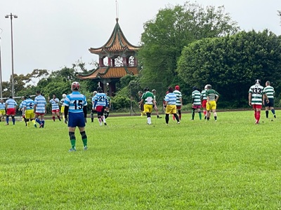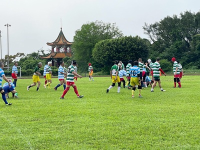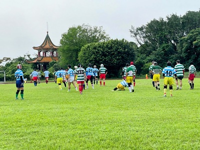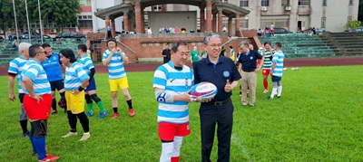 橄欖球友誼賽盛況空前,集結「台灣長青橄欖球俱樂部」會員、新埔及光武工專校友將近50位熱血男兒齊聚風雨球場。