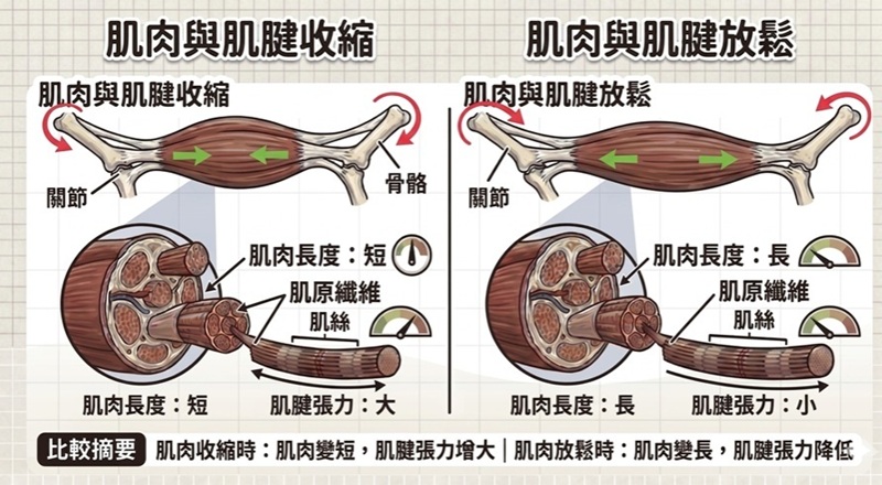 這就需要一點簡單的解剖學概念了。大部分的同學都有吃過雞腿吧?(吃素的勉為其難觀察一下吧,這跟咱身體的肌肉組成比較像)肌肉與肌腱(就是白白細長又不容易咬爛的部分)其實是同屬與「一個肌肉」,特別的是「肉」的部分是會收縮的,而「腱」的部分不會收縮。所以當「肉」縮的越大力,「腱」的張力就會越大,而「腱」大部分為控制關節活動,「腱」越緊,關節活動度就越小。大部份的血管、神經循環系統是會經過「肉」的部分,而非「腱」。所以身體不喜歡肌肉長時間處在大張力的狀態,因此會想辦法將您們練好「緊縮」的肌肉放鬆掉。可是如果又不給肌肉適當的訓練,身體真的會完全「鬆」掉,這也不好,畢竟深層的肌肉群是會幫忙血液及淋巴的循環順暢的。其實身體要強壯健康,重點在肌筋膜、肌腱膜等等各種「膜」。