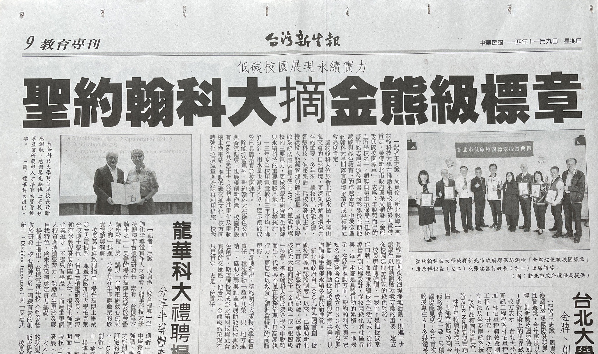 | 深耕低碳校園 聖約翰科大勇奪金熊獎