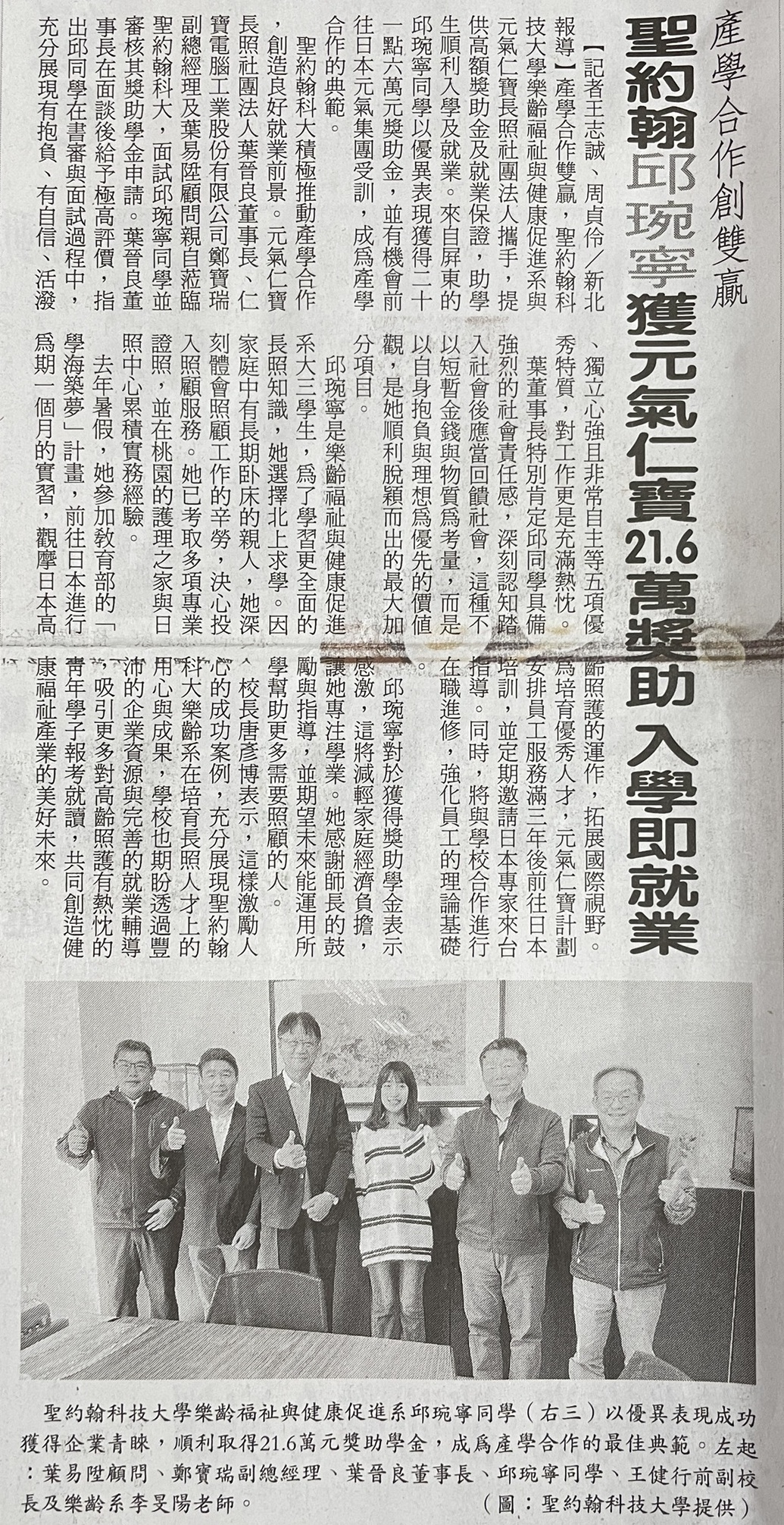 | 產學合作創雙贏 聖約翰邱琬寧獲元氣仁寶21.6萬獎助 入學即就業