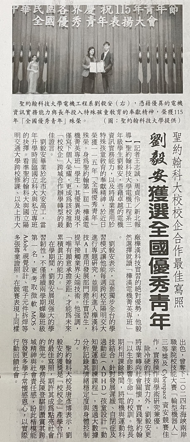| 聖約翰科大校校企合作最佳寫照 劉毅安獲選全國優秀青年 |